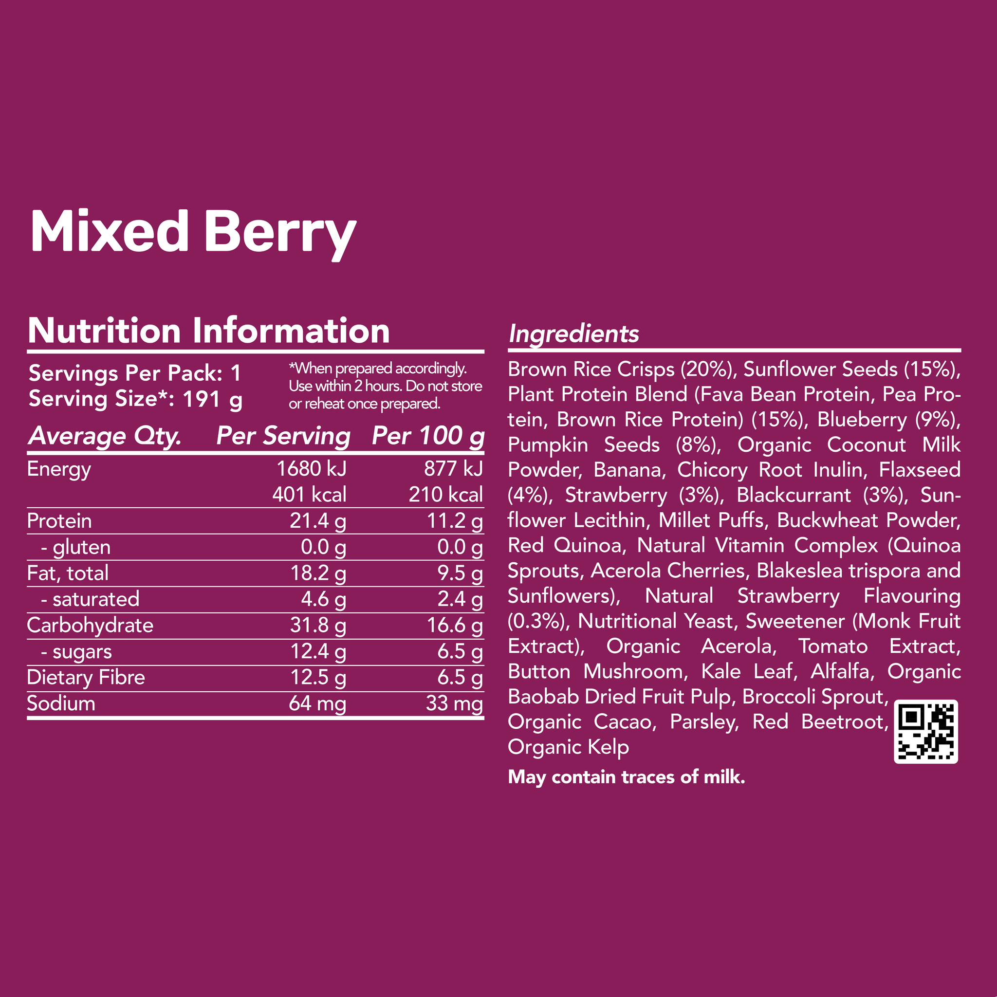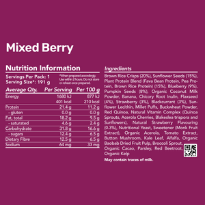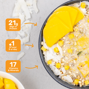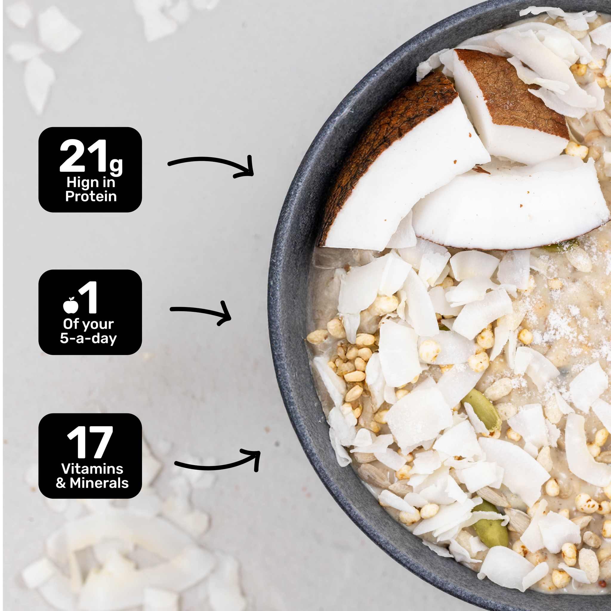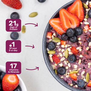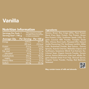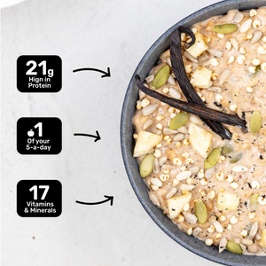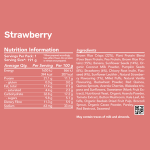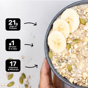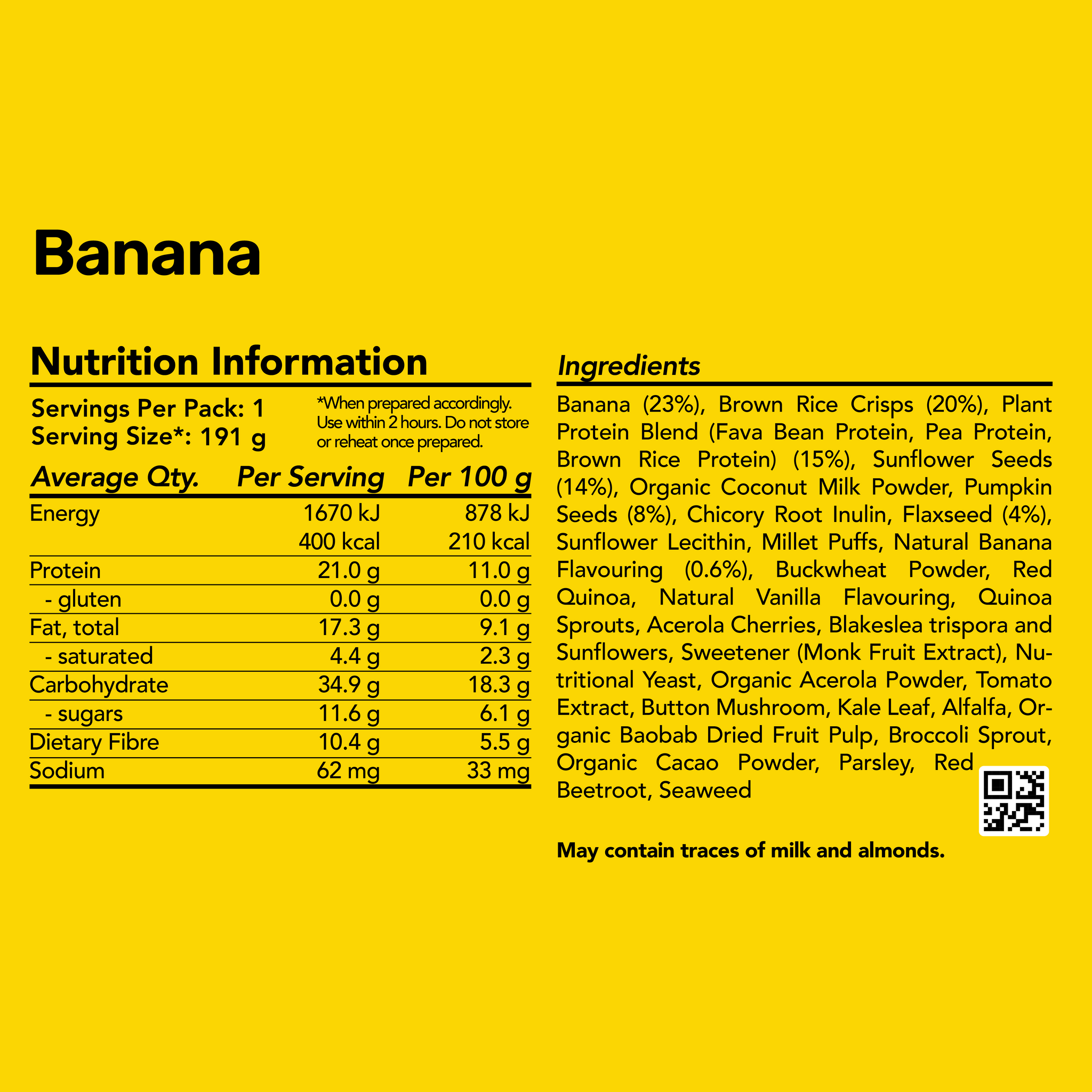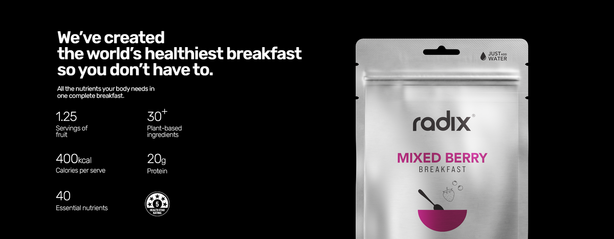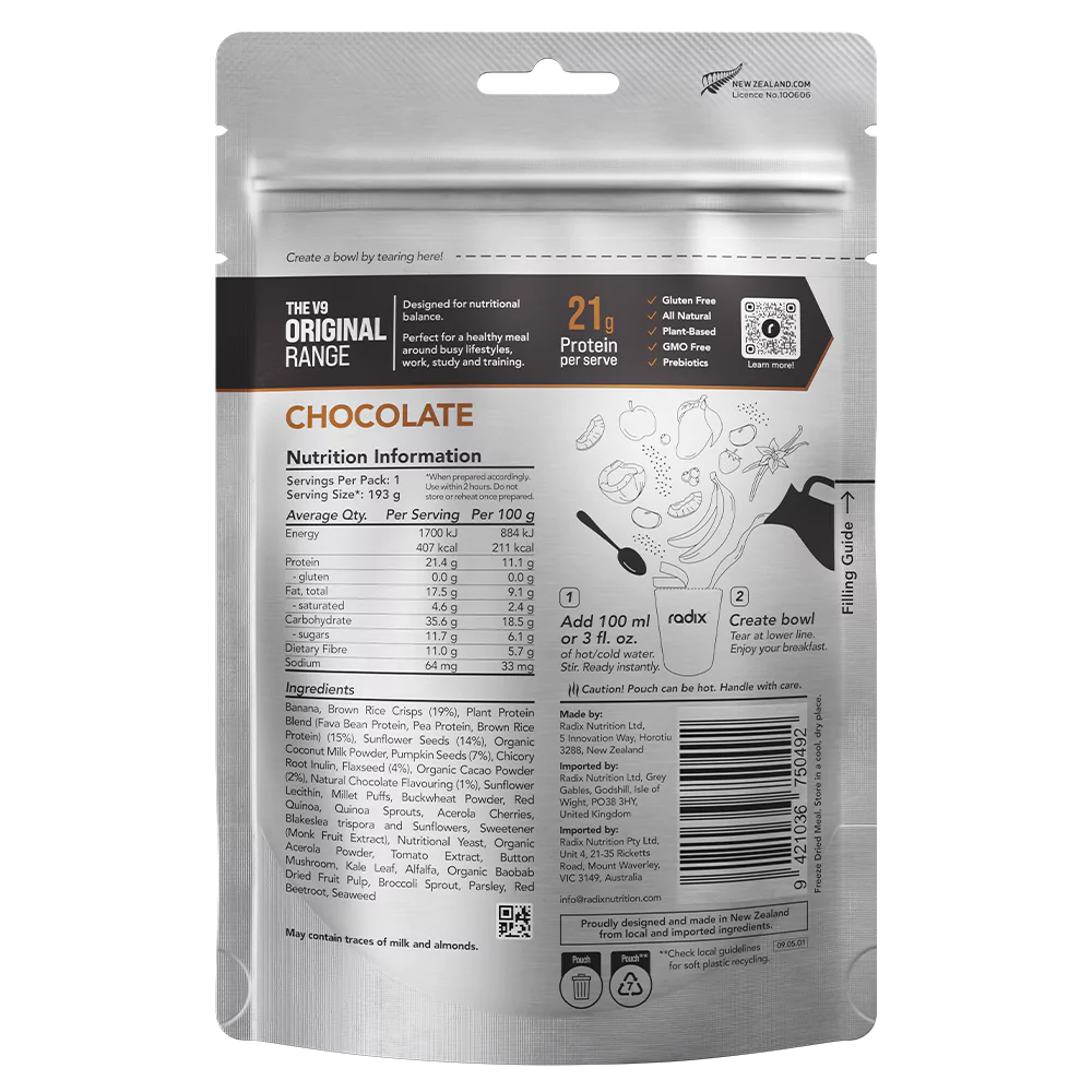 Radix Original Breakfasts contain 100+ vitamins, minerals and nutrients, with each spoonful packed with wholefood ingredients like banana, organic acerola, organic cacao, sunflower seeds, fava bean protein, and more. All in all, they contain 30+ superfoods, fruits, grains, proteins and real flavours that have been carefully curated to ensure you get a whole load of benefits in every spoonful – from support for your immune system and gut health to boosting your metabolism and muscle recovery. View our ingredients panel above for more information.
