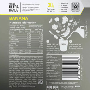 Radix Ultra Breakfasts contain 100+ vitamins, minerals and nutrients, with each spoonful packed with wholefood ingredients like banana, organic acerola, organic cacao, sunflower seeds, fava bean protein, and more. All in all, they contain 30+ superfoods, fruits, grains, proteins and real flavours that have been carefully curated to ensure you get a whole load of benefits in every spoonful – from support for your immune system and gut health to boosting your metabolism and muscle recovery. View our ingredients panel above for more information.
